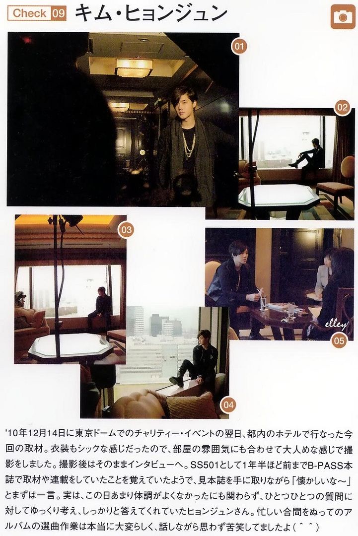 This interview was held a day after the 14th December 2010 Charity event at Tokyo Dome in a local hotel. His dressing has the chic feeling and together with the mood in the room giving an adult look during the photographing. Right after the photographing is the interview. Having the magazine in his hand and seemed to remembered that about one and a half year ago, SS501 had interview and regular column on B-PASS magazine and said, “brings back memories~”.